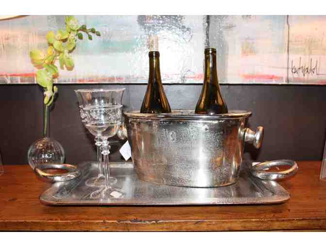 Table top 2 bottle wine bucket and ice cooler in aluminum from Zodax. Wine glasses and platter featured in photo not included.