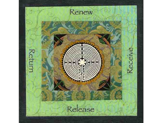 Mixed media labyrinth collage on archival matboard by Keddy Ann Outlaw. Approx. 4 x 4", sealed with a potective coating. Packaged in sealed cellophane for gift giving.
