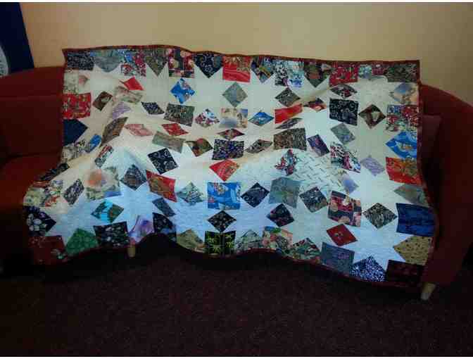 Snuggle up with this beautiful handmade quilt. The star motif pattern is made using Japanese-inspired prints. Measuring 72" x 52" this all-cotton quilt would work well for a twin bed or as a generous lap quilt. Don't miss your chance to own this one-of-a-kind treasure!