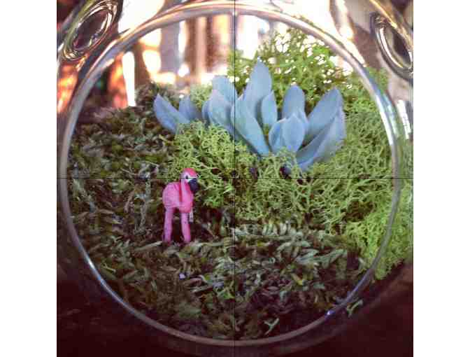 The hanging glass terrarium Sherman lives in has a diameter of 4.5" with a 2.5" opening in the front as well as a built-in glass loop at the top for hanging. A small area on the bottom is flat so that it can be just as happy on a coffee table, shelf or a pile of books.