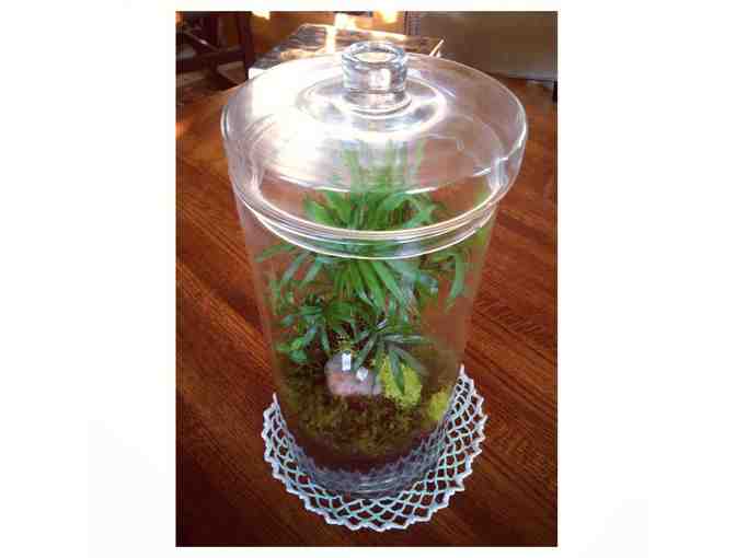 This standing glass terrarium is 10" tall and 6" wide. Perfect for a coffee table, end table or any other spot with indirect light.