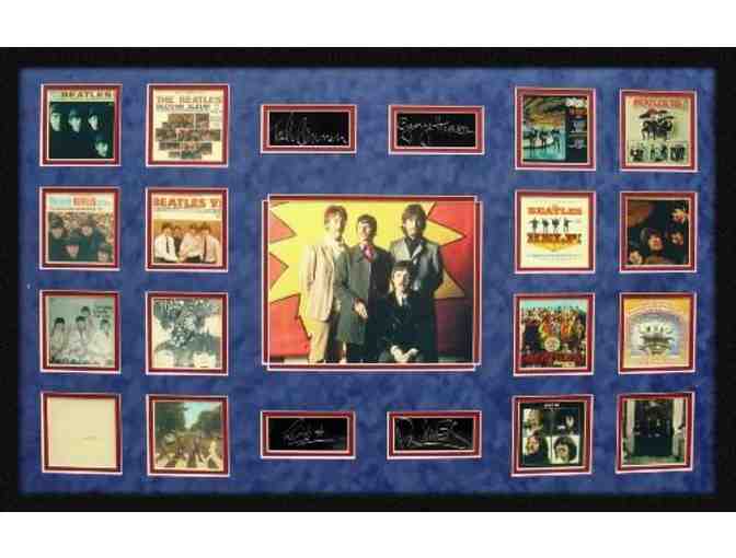 Arguably the best rock band of the last century, the Beatles have rocked out in more ways than one while becoming the most irresistible group of British men to be adored by the American public. With multiple album releases, record high album sales, and surviving tragedy and triumph, the Beatles are here forever. From John Lennon and Paul McCartney to Ringo Starr and George Harrison, this limited edition masterpiece collage features all of The Beatles US-released album covers, professionally double-matted and framed. Certificate of Authenticity included.