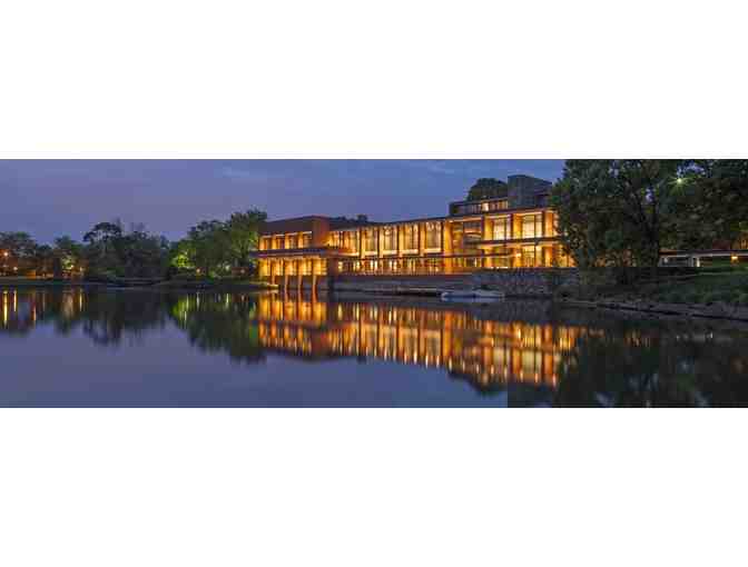 Relax for an overnight stay at The Hyatt Lodge at McDonald's Corporate Campus which features a beautifully landscaped forest preserve. The property and amenities will delight your senses, complete with private lake and pampering spa. Within minutes of the luxury hotel you will find Oak Brook Shopping Center for the latest fashion and retail choices. The campus is full of natured trails, excellent dining and a health club with a 70-foot indoor pool.