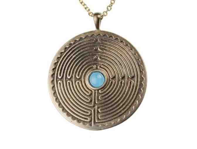 This Chartres labyrinth pendant is made from disarmed and recycled nuclear weapons systems. The pendant is 1 1/2" in diameter, contains a 6mm smithsonite gemstone, and comes with an 18" rolo chain.