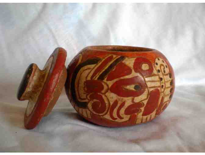 This small, handmade jar from El Salvador is a great decor piece for a shelf or coffee table. Or have it act as a holder for jewelry or other small items. The exterior is beautifully painted with Mayan images.