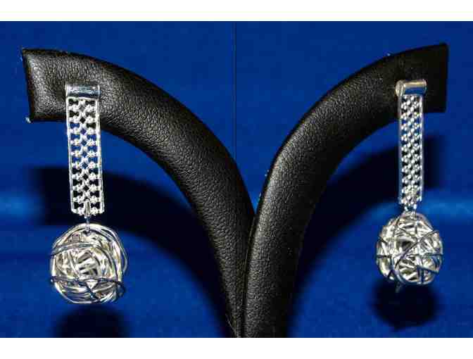 balls dangle playfully from lacy patterned openwork wire topped by shiny little tunnels finished with sterling silver posts and backs. Light, airy and comfortable, they will not weigh down your ears but are sure to elicit compliments. The overall length of each earring is 1 ¼ inches.