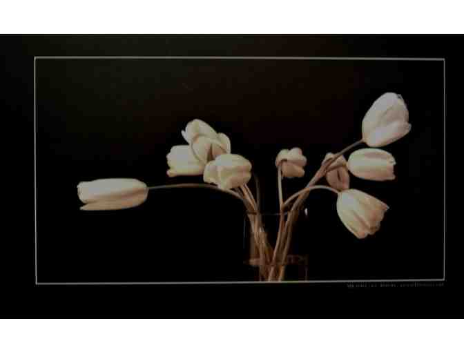Original black and white photographic print "Tulips" on black board from professional photographer Michael Eric Berube of Dresden, Maine. Finished piece is 17" x 11" and is ready to hang.