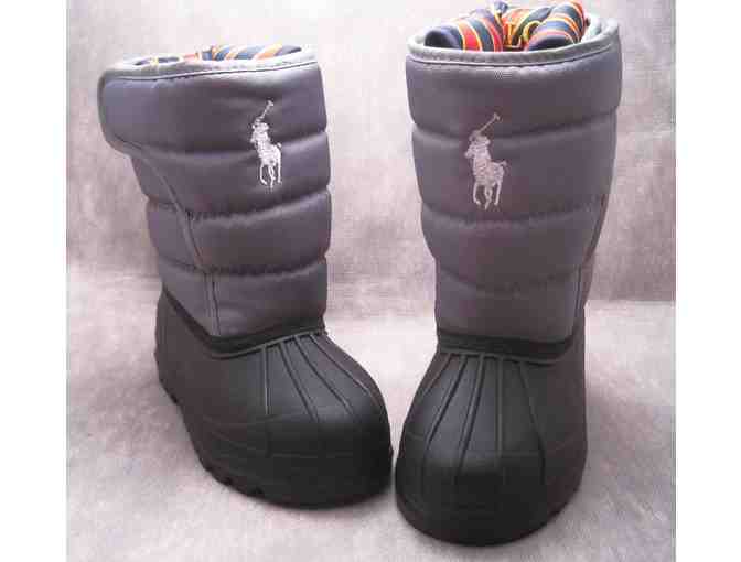 New Polo Ralph Lauren winter children's boots. Navy, red and gold striped lining. Black rubber bottom, gray nylon upper, velcro closure.