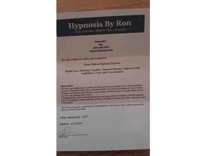 Gift Certificate for 3 Clinical Hypnosis Sessions valued at $450. Expires 3/31/14