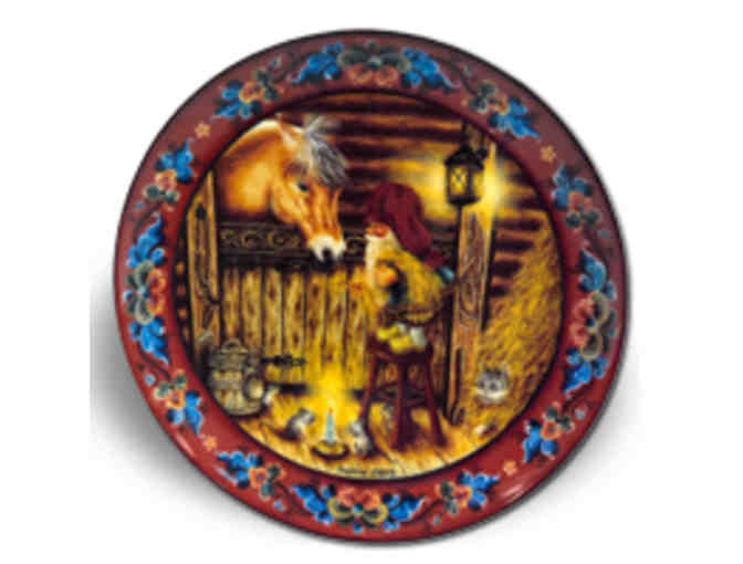 This charming Christmas plate has the Julenisse visiting the fjord horse in the barn on Christmas Eve. The scene is magical with the light from the lantern casting soft light on the carved horse stall, the kitty in the hay mound and the mice warming themselves by the candle. The edge of the plate is earth red with traditional rosemaling patterns with blue, green and gold accents. The body of the plate is in warm browns, golds and red.