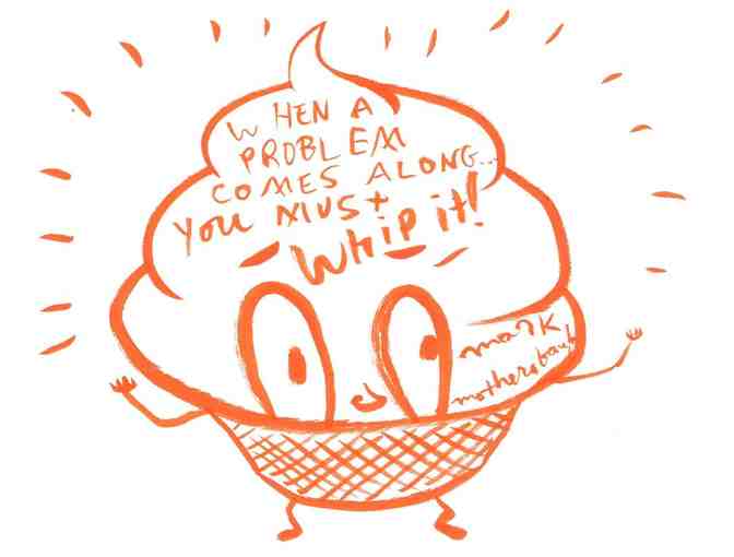 One of the most recognizable new wave songs of the 70's, and perhaps of all time, is Devo's "Whip It." And now you can own this original doodle from the co-founder and lead singer of the band, Mark Mothersbaugh. Mark has included that famous lyric "When a problem comes along, you must Whip It" on this special one-of-a-kind rock history doodle. View the original "Whip It" music video at YouTube here: