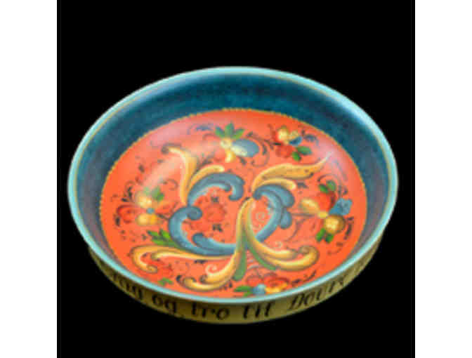 This 12" across, 3 1/2" deep round bowl was handturned by Paul Loftness and rosemaled by award winning artist Shirley Evenstad in the Telemark style.  It is red framed by krill blue border and has a dark blue lazured exterior.  It has traditional Norwegian colors - muted shades of blue, red, yellow and green.  Lettered on the rim is the Sons of Norway motto "Enig og tro til Dovre faller", translated to "United and true until the Dovre mountains fall."  If you collect rosemaling, this one is for you.