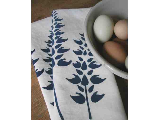 2 hand tea towels and 4 matching napkins in hand-stitched, hand-printed ecofriendly organic linen featuring an iconic Maine image of dusk purple lupine. Products are machine washable and highly durable. Christina Wentworth '05, one-half of the Madder Root team, studied print making at UMaine and and at Edith Cowan University in Perth, Australia, mastering the art of screen-printing. She currently works in the print shop at the university. Janyce Boynton is a lifelong fiber artist and talented seamstress.