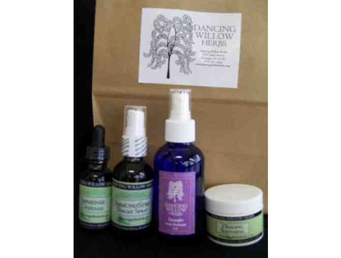 Pamper yourself with these specialty tinctures from Dancing Willow Herbs. Included in gift basket is: Immuno Stim Throat Spray, Immense Defense, Healing/Soothing Salve, and Lavendar Room Freshener.