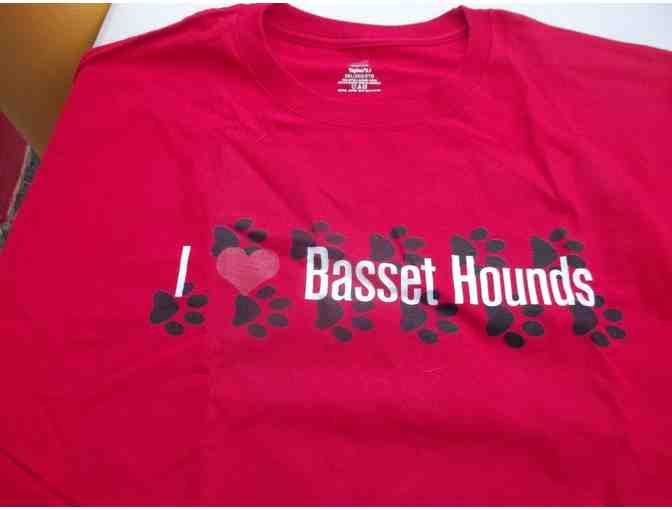 This 2XL T-shirt is red and has pawprints going across the I <3 Basset Hounds saying on the front of the shirt