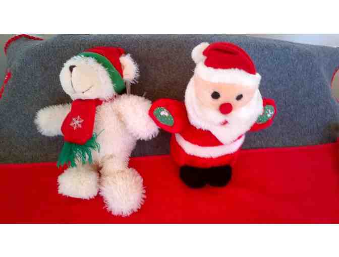 A squeeky bear dog toy from Pet Holiday, approximately 11" tall and a squeeky Santa dog toy, approximately 9" tall. New