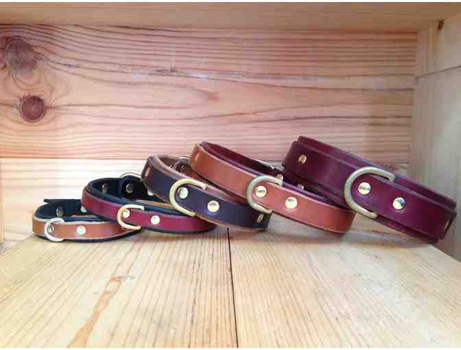 This collar, from Paco's Signature Collection, combines two layers of latigo leather to make a statement of sophistication. The two-toned collar measures 1" wide and is made from heavy weight tan-colored latigo weather with a 3/4" wide top strip in chocolate brown. Collar is adorned with structural rivets in brass, with two D rings, one next to the buckle and one placed opposite. Collar fits necks sized 13"-15".