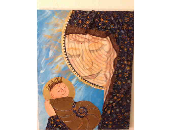 Assemblage image using paint, oil pastel, paper, cloth, trims, beads. 22X28 canvas without frame.