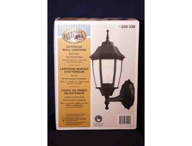 This black Hampton Bay outdoor dusk-to-dawn wall lantern with clear beveled glass will bring beauty to your home. New - never opened, in original box.