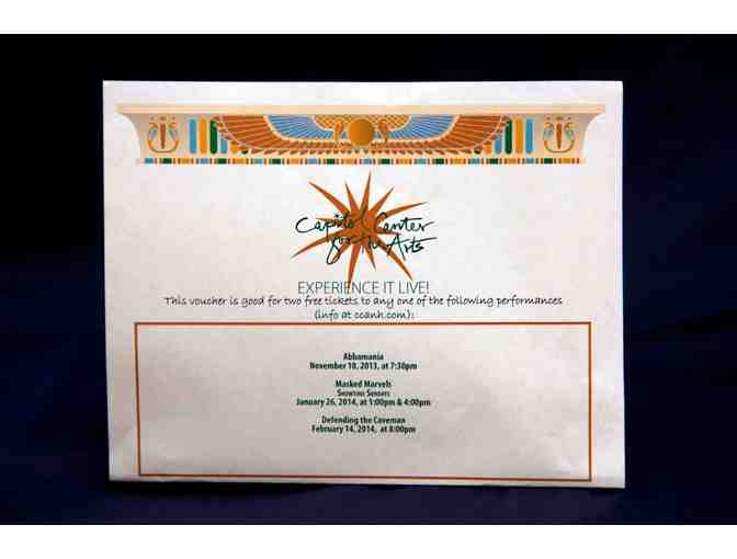 This Capitol Center for the Arts voucher is good for two free tickets to any of the following performances (info at ccanh.com): "Abbamania" 11/10/13 at 7:30 pm, "Masked Marvels" 1/26/14 at 1:00 pm and 4:00 pm, and "Defending the Caveman" 2/14/14 at 8:00 pm.