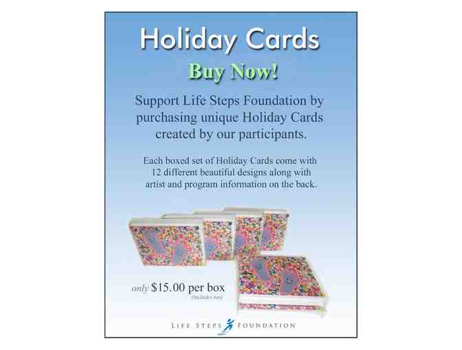 A Boxed Set of 12 unique Holiday Cards, created by participants of the various Life Steps service programs for the developmentally and physically disabled. On the back is information about the artist and the Life Steps program they attend. Inside, the cards are blank so you can customized your message by hand or laser printer. Each boxed set also includes 12 envelopes. All proceeds of these cards sales goes to benefit specific Life Steps programs.