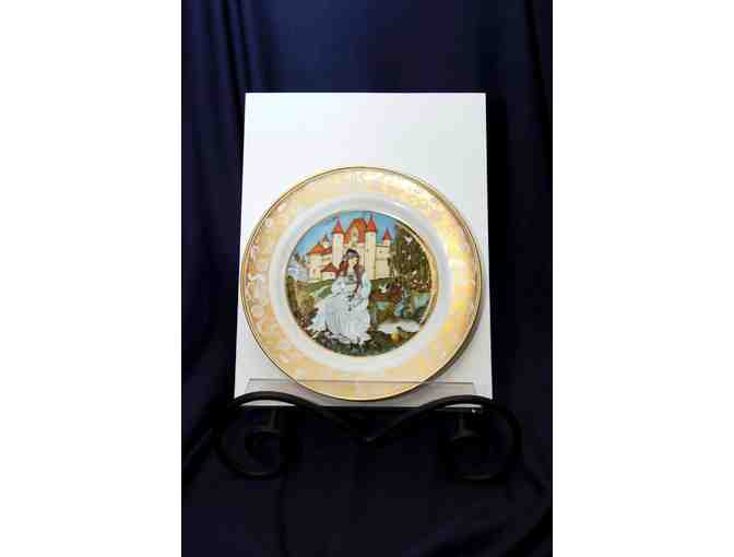 Complete set of 12 limited edition Franklin Mint Fairy Tale porcelain plates (c)1978. Each plate depicts one of the beloved tales of the Brother's Grimm; 24K gold decoration of butterflies, swans and roses surrounds original artwork created for this collection; 8" diameter each; excellent condition; includes plate holders.