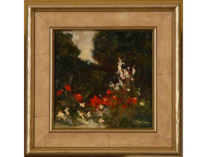 "Garden over Dusk" is painted on a 6 X 6 panel. The juxtaposition of the thick, painterly flowers and the more simplified darkened background portrays an incredible sense of vastness on such an intimate scale. Christina provides just a minimal amount of sky in this work, which is just enough to provide the viewer with a suggestion to the time of day.
