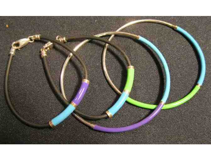 Colors include blue, purple, and green.  Bracelets have black flexible bands; bangles have metal bands.  Bracelet clasps marked sterling silver.