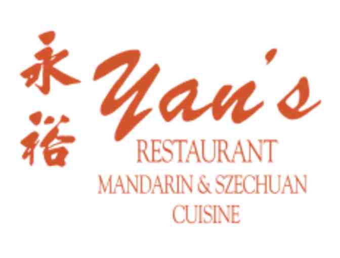 $25 gift certificate for Yan's Restaurant, specializing in authentic Mandarin and Szechuan cuisine. Located in Orinda.
