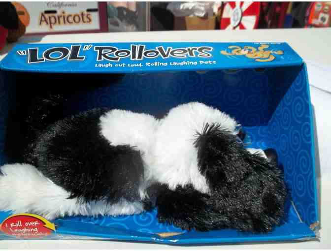 This cute black and white dog laughs and rolls over when you press his paw. Batteries not included