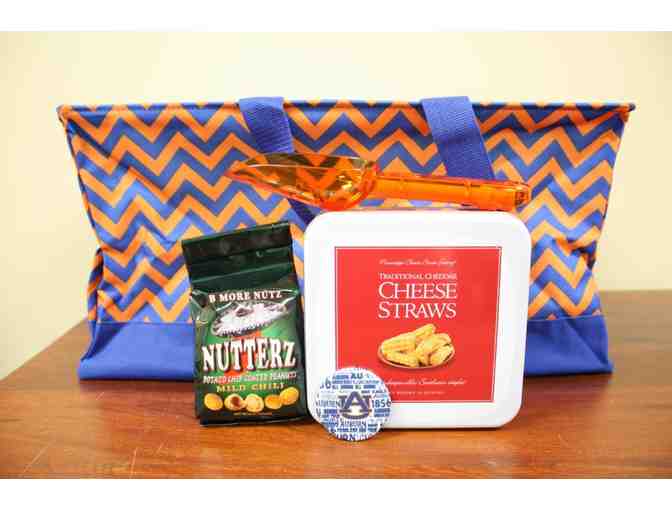 4 tickets to the Auburn vs. Georgia game (Lower West, Seats 6-9, Section 7) along with a crunch bin in Auburn colors, decorative ice scoops, button, cheese straws, and Nutterz.
