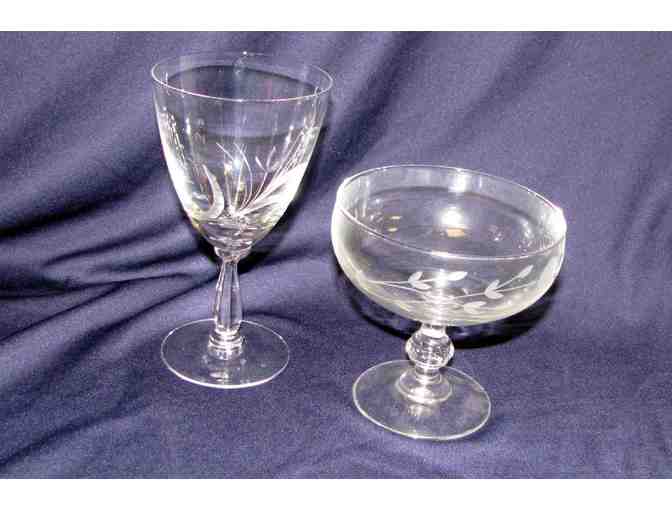 Enjoy four etched glass water glasses, and four sherbet glasses. Each glass is etched with a flower design and would be a nice addition to your dinner setting.