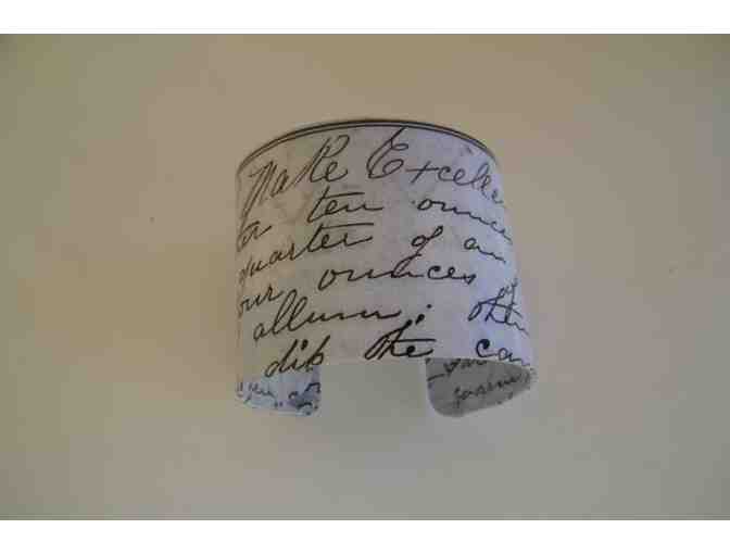 2 inch width; components - metal, adhesive, paper; metal base, non-toxic materials, glossy finish; 1861 cuffs are created from the pages of the artisan's great grandfather's journal of remedies and "receipts" devised as cures for ailments such as scarlet fever, whooping cough, sore eyes, headaches and for making ink, candles, wines and cordials; this cuff shows a partial recipe "To Make Excellent Candles" on exterior and "Receipt for Scarlet Fever" on interior; cuff may be squeezed firmly but gently to secure fit; from the journal of Robert Draper, born 1836 in Melbourne, Derbyshire, England and died in 1886 at Canton, Massachusetts.