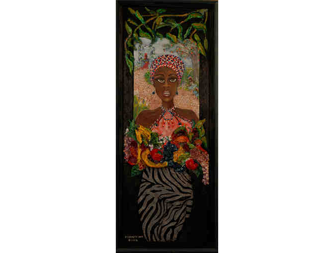 Piece Description: Dimensional scene showing the subject stepping out of her realm of comfort into a world she knows nothing about . She brings with her the harvest from her past life into the future and although she knows very little of why she is venturing out of her realm , it is her inner voice leading the way to a brand new adventure . She is generously offering all that she has learned from her past as a gift to her future .