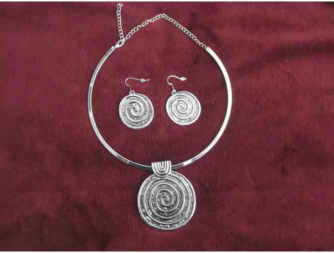 Beautiful silver colored necklace and earrings with a spiral motif for your inner goddess.