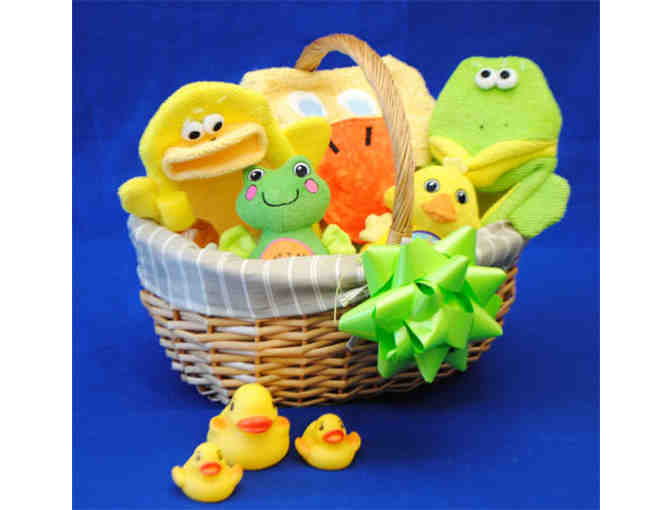 This adorable basket is filled with supplies and toys to make bathtime fun for your little one.