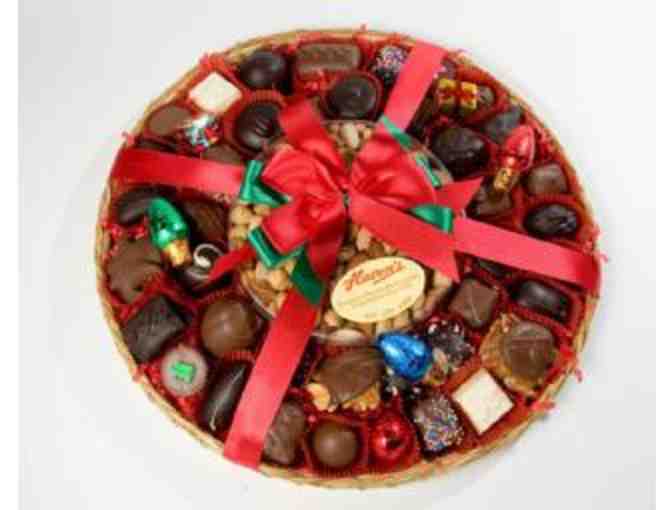 This festive item includes 1.5 lbs. of our premium handcrafted chocolates and 1 lb. of our finest roasted mixed nuts. Decorated with seasonal chocolate pieces and clear wrapped with a colorful bow.