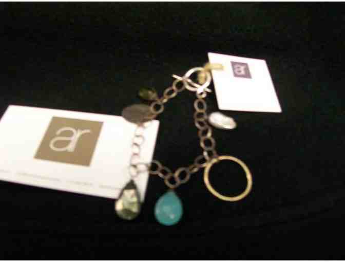 This beautiful bracelet made by Alexis Russell has stones including citrine, pyrite, chalcedony, and fresh water pearl. It is sterling silver, with a +14 karat gold charm.