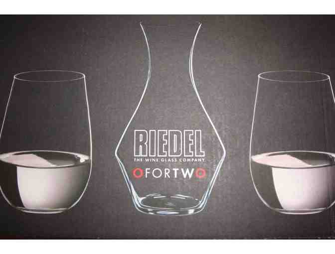 One of the hottest new designs in the wine world, the O series from renowned Austrian glassmaker Riedel includes this O For Two tasting set. The set contains two stemless O glasses that each stands 4-1/8 inches high and holds 13-1/4 ounces at full capacity, along with a 6-1/4-inch, 15-3/4-ounce decanter. Known as the Mini-Cabernet, the diamond-shape decanter is taken from Riedel's Vinum Extreme collection, a modern match for the O tumblers.