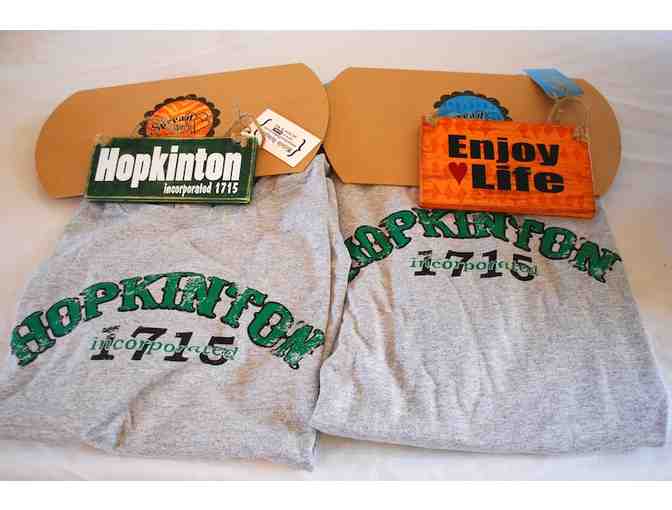 Includes: two Hopkinton t-shirts sizes large and medium, and two small wooden signs: Hopkinton Incorporated 1715 and Enjoy Life.