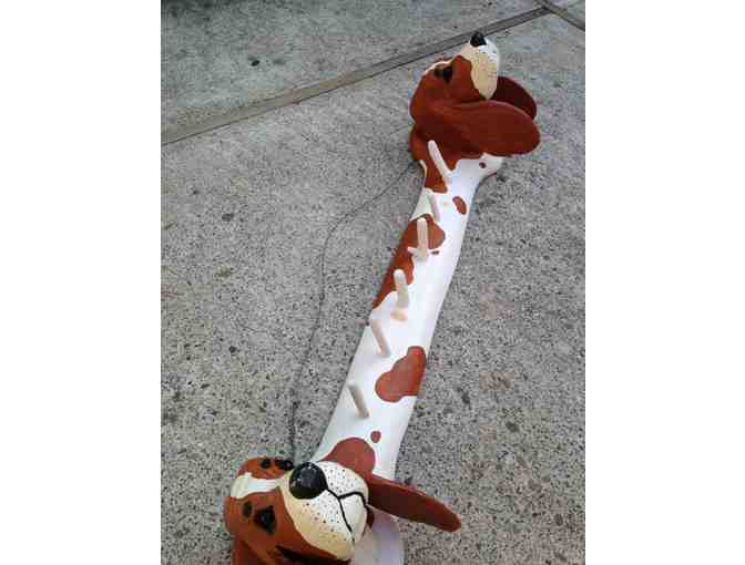 This coat rack was custom made for our donor at the top animal art store, Mable's of Madison Ave, New York (which apparently is not there any more). She paid $1500 for it when it was made. It is engraved with the name Bruce N Murphy, 1989. It has been loved and now it is donated to raise money for our rescue basset hounds!