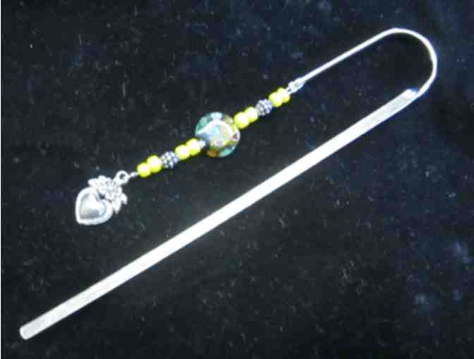 Handmade beaded bookmark. A heart with flower accents the string of yellow beads with multicolor center bead.