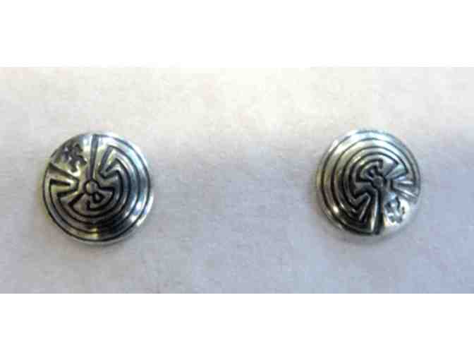 Slightly smaller than .5" diameter, these sterling silver earrings feature the man in the maze labyrinth.