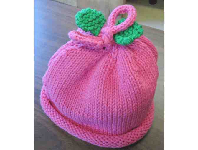 Lovingly knitted girl's beanie in pink with green leaves. 9" diameter.