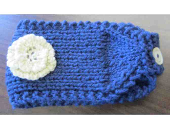 Stay warm this winter in this cozy handmade dark blue knitted head wrap with cream flower. Measures 8" in diameter and buttons at the back.