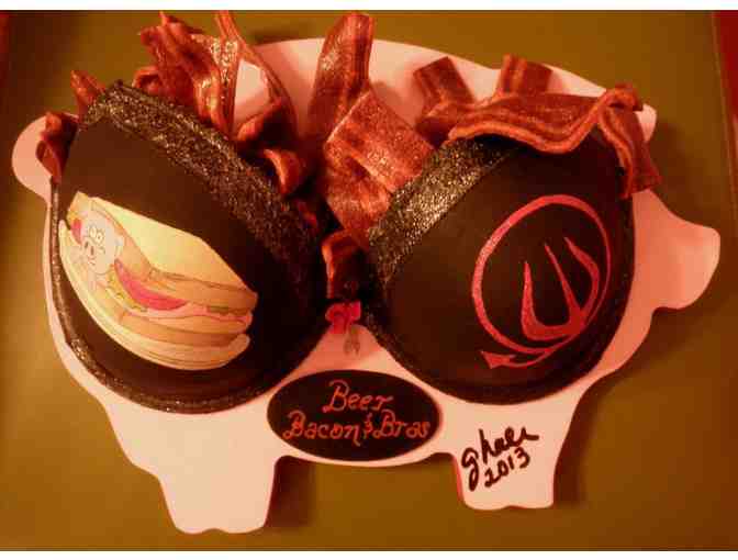 Awesome Straight To Ale logo bra, mounted on a Pig shaped board, with Bacon (Beggin' Strips, coated) for a garnish!