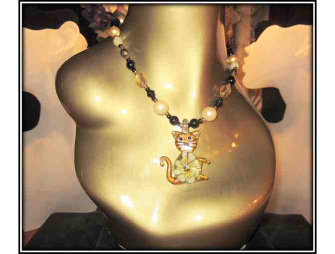 1/KIND GEMSTONE NECKLACE with Art Glass Kitty Cat Pendant