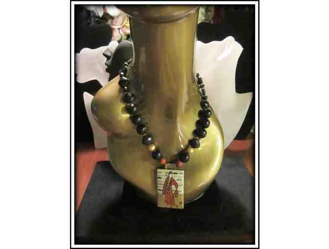 Featured Components: Faceted and Smooth Black Onyx, Austrian Crystal Pearls, Accent Beads, Hand Painted Enamel Art Pendant