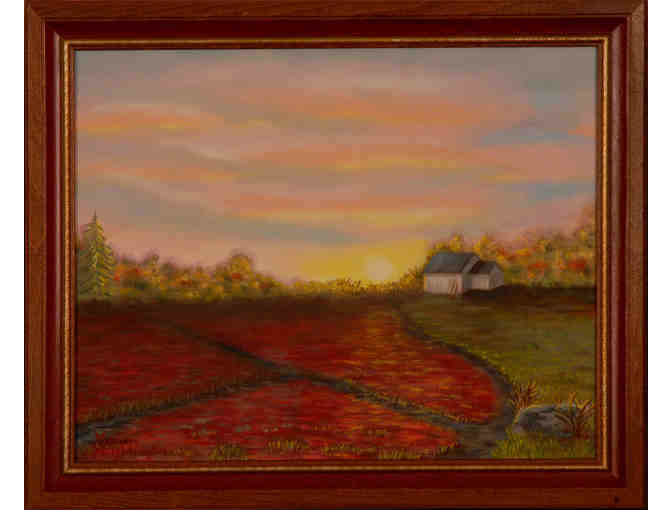 This 20" x 24" oil on canvas board is one of my favorite Fall scenes. Cranberry bogs are nature's gems in New England. The natural, colorful beauty of a bog, ready for harvest, is so bright and lively, but also seems peaceful. Complete with a bog house, the late sunset just seems to make the colors glow. The piece is framed in wood with red and gold accents.