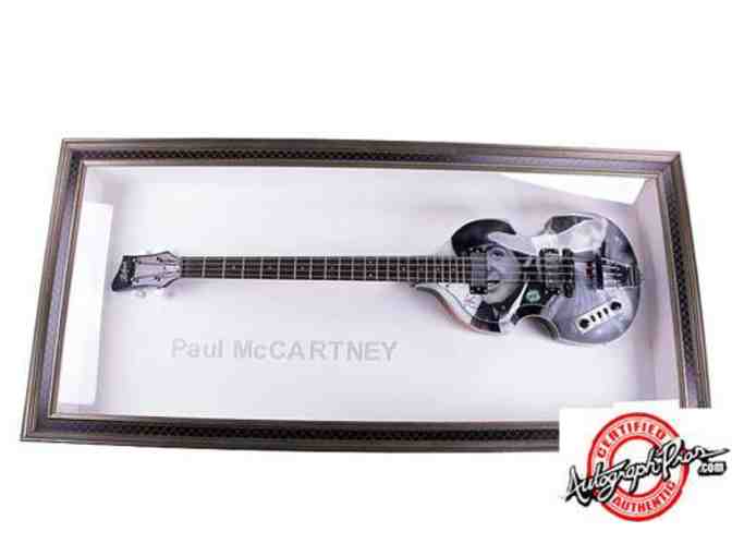 THIS IS A HOFNER LEFT HANDED BASS GUITAR (SIMILAR TO THE EXACT ONE HE PLAYS ON STAGE) AND IT HAS BEEN CUSTOM AIRBRUSHED TO MAKE THIS ONE OF A KIND WORK OF ART! IT COMES IN A ONE OF A KIND CUSTOM DISPLAY SHADOWBOX MEASURING 52" X 23" X 6" WITH A LINEN MATT BACKGROUND, THE BEATLES FONT NAME LASER-CUT INTO THE FABRIC, AND THE GUITAR IS MOUNTED INTERNALLY IN A FASHION TO ENSURE NO DAMAGE IS DONE TO THIS INCREDIBLE PIECE OF MEMORABILIA. WHAT MAKES THIS EVEN MORE AMAZING IS THAT IT FEATURES HIS HAND SIGNED AUTOGRAPH PUT RIGHT ONTO IT! THIS ITEM COMES CERTFIED AUTHENTIC WITH A CERTIFICATE OF AUTHENTICITY AND WRITTEN LIFETIME GUARANTEE FROM UACC REGISTERED DEALER #237 AND 2011 UACC AUTOGRAPH DEALER OF THE YEAR: AUTOGRAPH PROS.